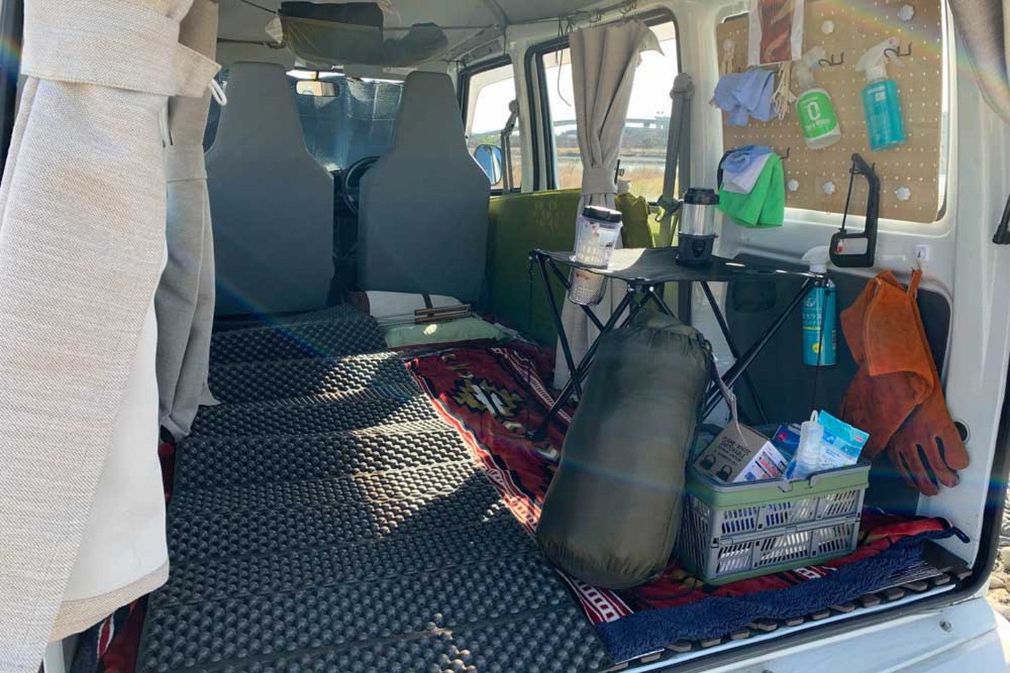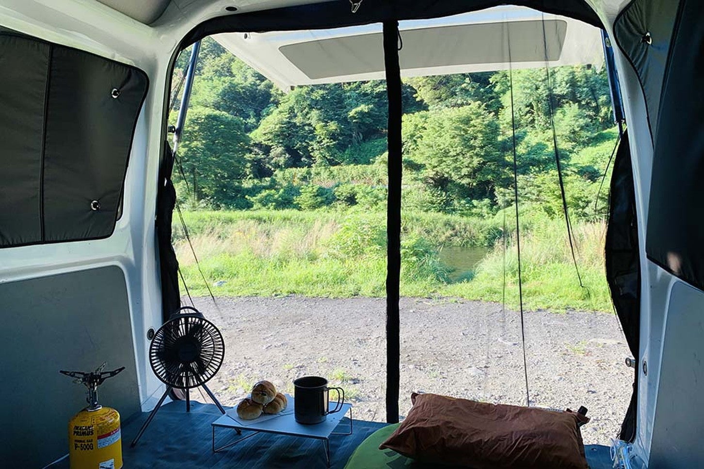 必要な持ち物はそれほど多くなく、過ごしやすい時期であれば寝具・照明・目隠しさえあればOK。生活の軸足を車に置くバンライフと比べると、気軽に始められるのも魅力です。