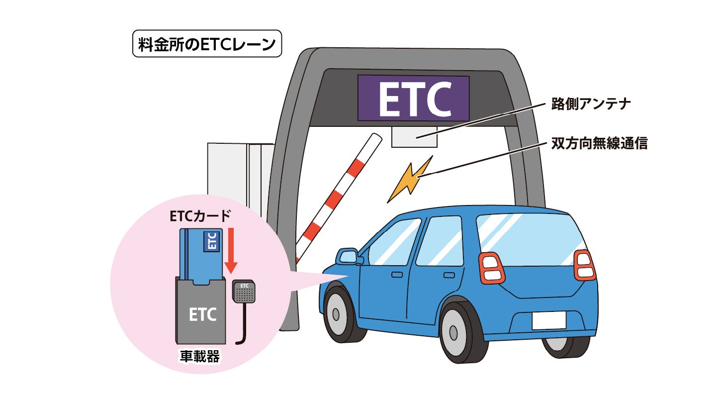 ETC(Electronic Toll Collection System)は、高速道路や有料道路で料金を自動的に支払えるシステムです。車に取り付けた車載器にカードを入れておけば、料金所のアンテナと通信して、止まることなくスムーズに通過できます。
