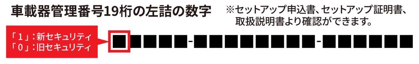 19桁の車載器管理番号が「1」から始まっている場合は、新セキュリティに対応しているため、今後も継続して利用できます。一方で、「0」から始まっている場合は旧セキュリティ対応となるため、新セキュリティへの移行後は使用できなくなります。