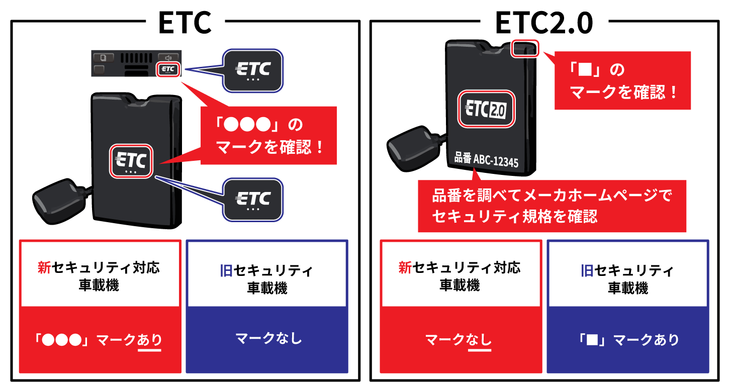 二つ目の方法は、車載器本体に表示されている識別マークを確認するものです。マークやロゴの有無で見分けられますが、ETC車載器とETC2.0車載器(ETC-DSRCを含む)では確認すべきポイントが異なるため、注意が必要です。