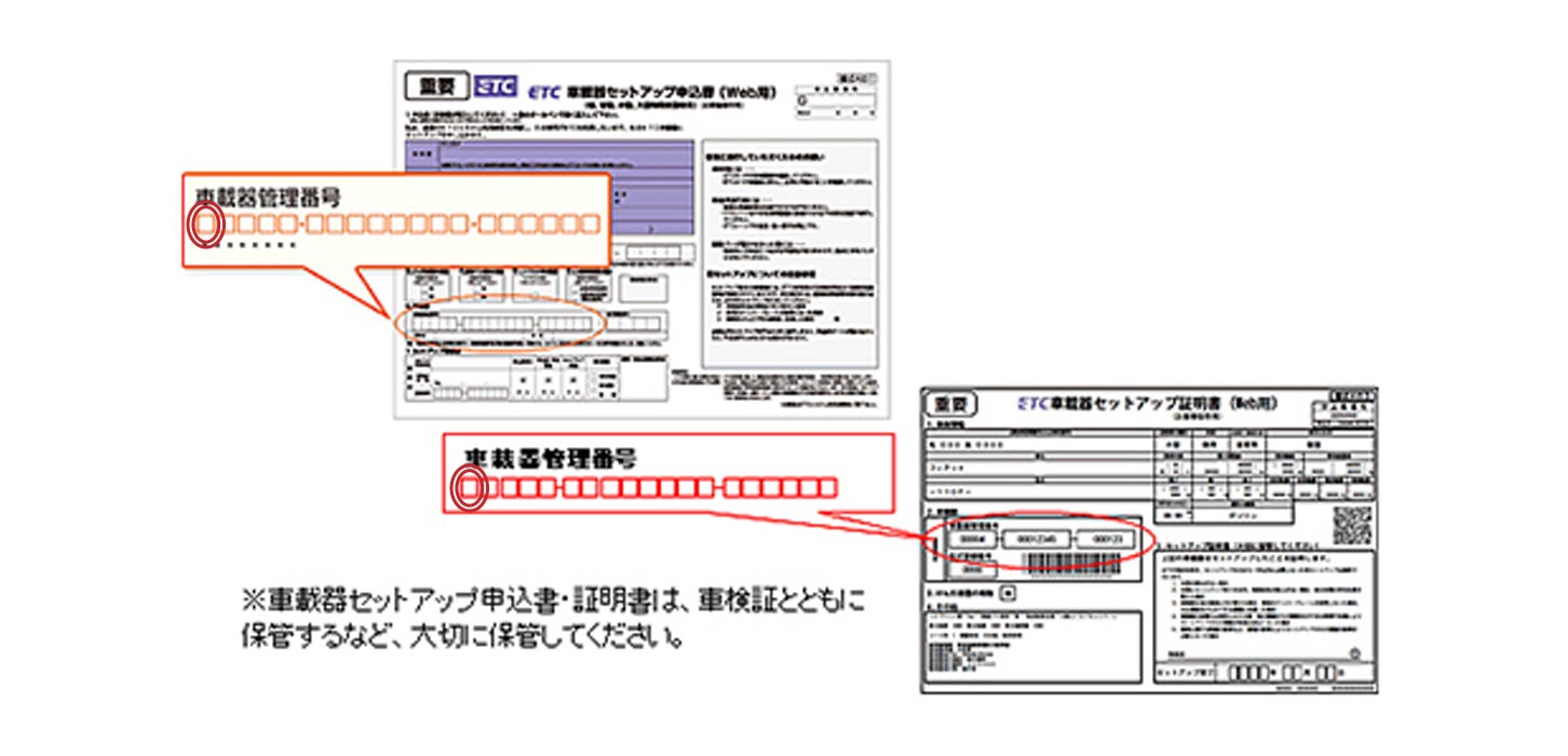 セットアップ申込書や証明書から調べられます。いずれも車載器取り付けの際、「車検証ファイル」に保管されていることが多いです。見つからない場合は購入・セットアップされた店舗へ問い合わせを。