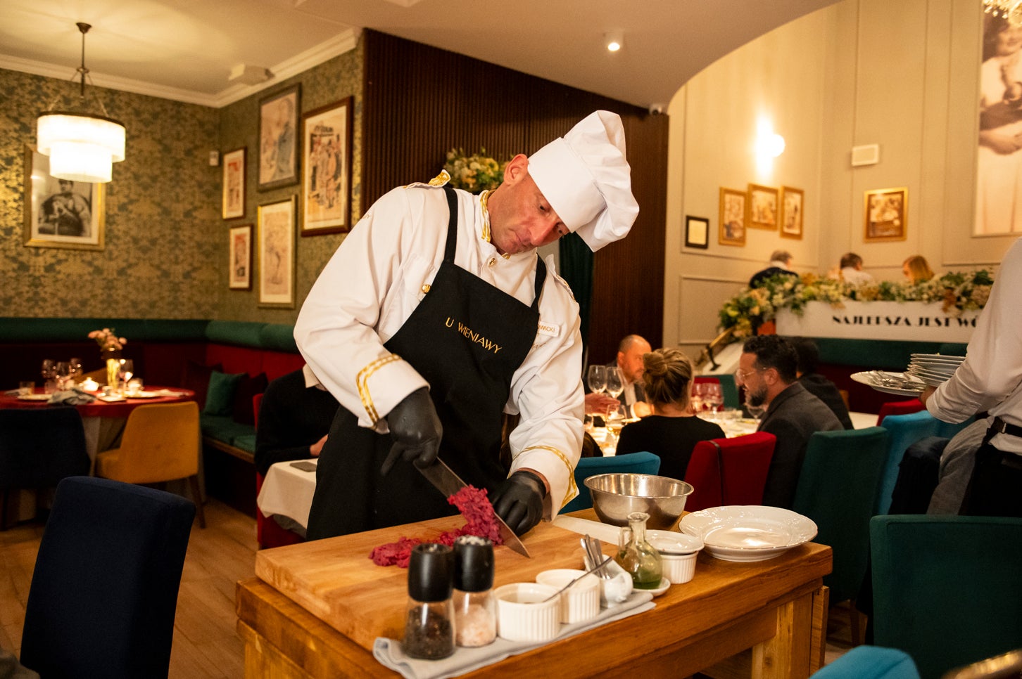 店内は居心地の良い雰囲気に包まれ、料理の新しい組み合わせを試したい人にぴったり。メニューを監修するのは、かつてポーランド大統領府の料理長を務めたクシシュトフ・コヴァルスキ氏。戦間期のエレガントなレシピを現代に蘇らせた上品な一皿から、ニシンの亜麻仁油漬けやミートボール、牛フィレ肉のタルタル、さらにはジャガイモと炒め玉ねぎを添えたランプステーキといったカジュアルな料理まで、多彩なメニューをラインナップ。