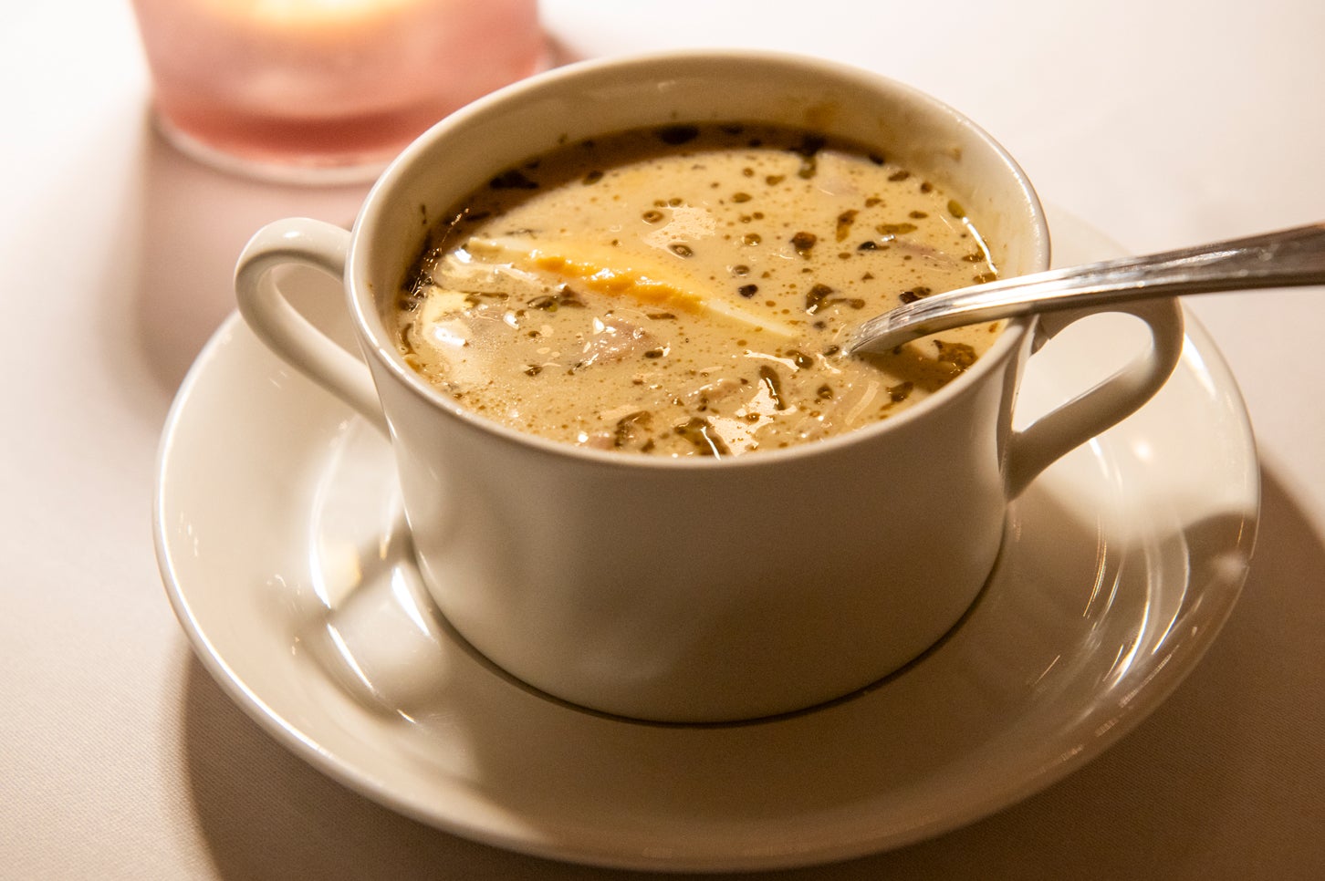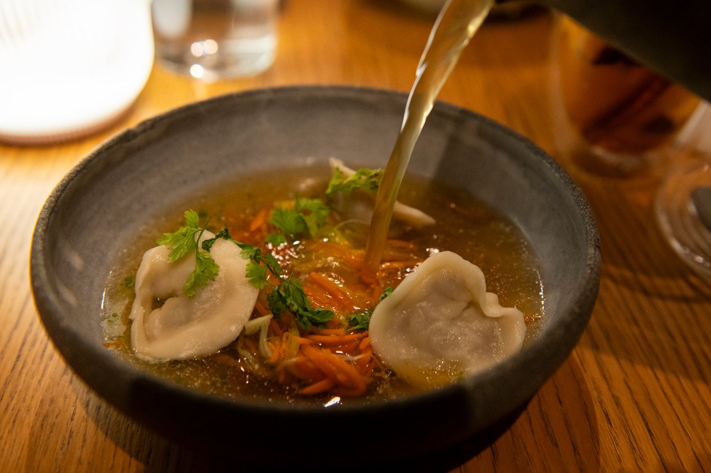 数ある料理の中で特に印象に残ったのは、ポーランドの伝統料理であるピエロギを鶏のコンソメスープと合わせた一品だ。餃子に似たピエロギを、澄んだスープに浮かべていただくと、口当たりは驚くほど軽やか。優しい味わいが疲れを癒し、思わずスプーンが止まらない。
