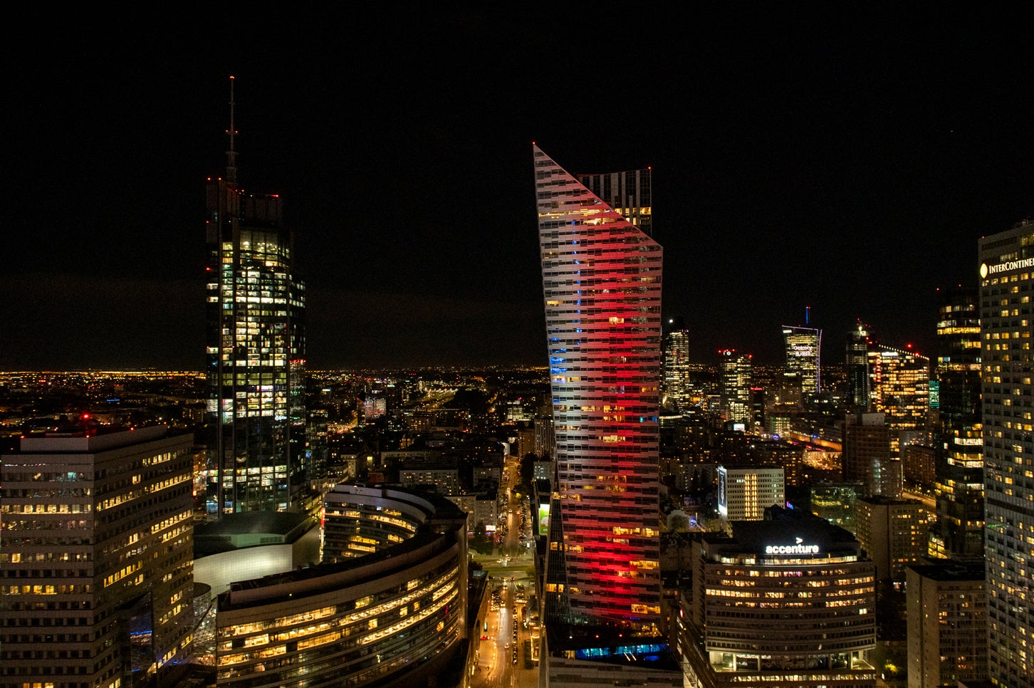 荘厳なエントランスを抜け、エレベーターで一気に30階へ。目の前に広がったのは、広大な展望テラスと、その先に広がる圧巻の夜景だ。360度どの角度からも、光の粒がきらめき、ワルシャワの活気が眼下に広がる。都市の息づかいを感じながら眺める夜景は、旅の始まりを祝福するかのように鮮やかだった。