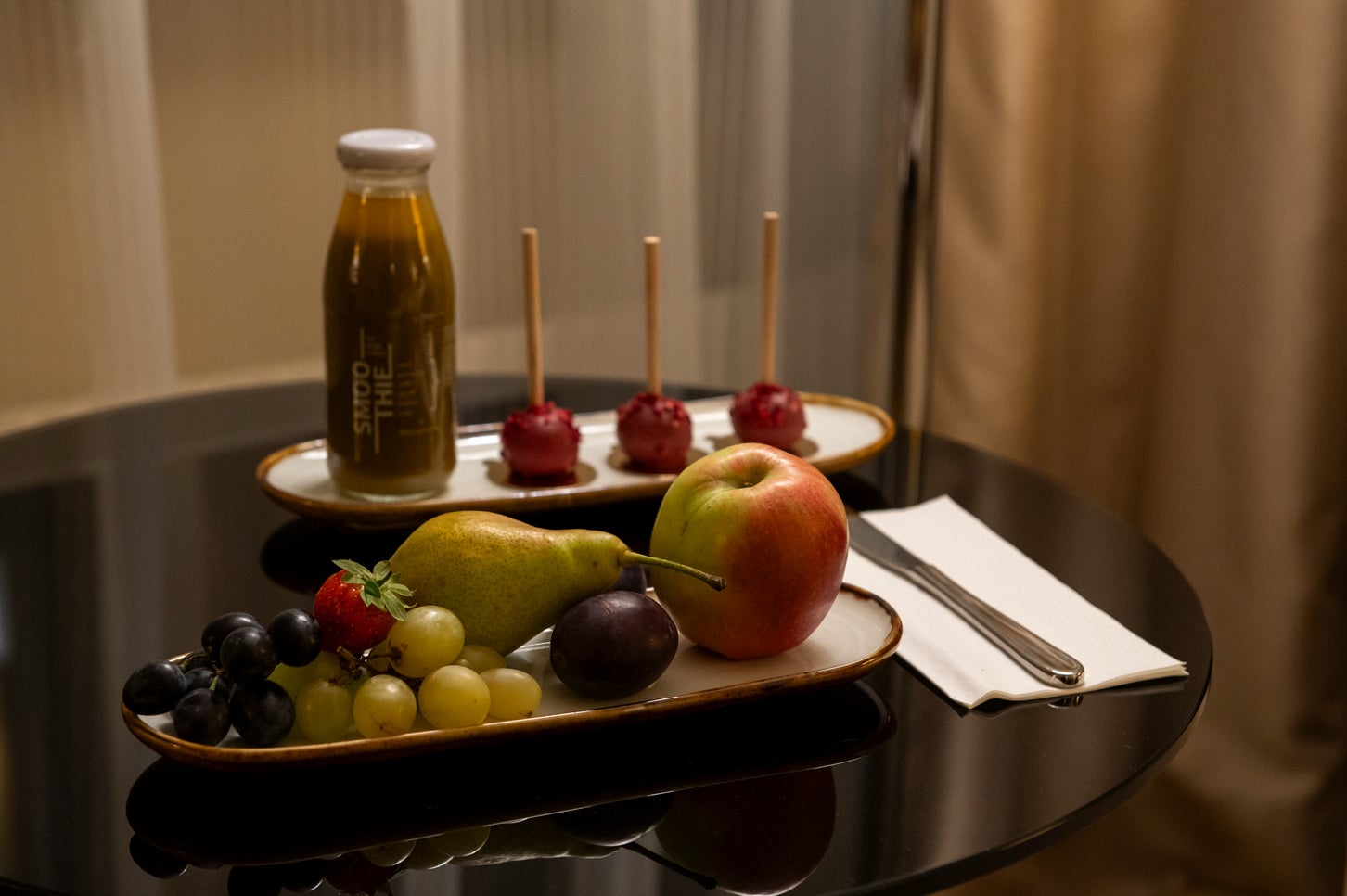 部屋に入ると、落ち着いた空間に迎えられる。ひとりで滞在するには十分な広さがあり、テーブルにはウェルカムフルーツとドリンク、さらに奥にはチョコレートがさりげなく置かれている。長旅の疲れをほぐすような心配りに思わず笑みがこぼれる。一口チョコを味わい、しばしの休息。軽やかな充足感に包まれながら、次は夕食に出かけようと気持ちが動く。