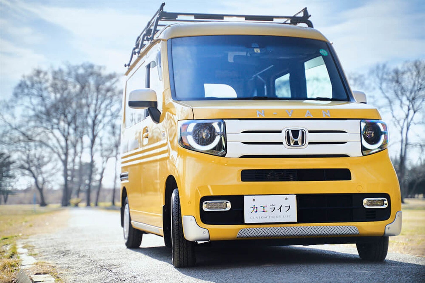 使用するクルマは、Hondaの軽自動車N-VAN(エヌバン)。助手席を倒してフルフラットにできるので、寝袋を余裕で広げられます。