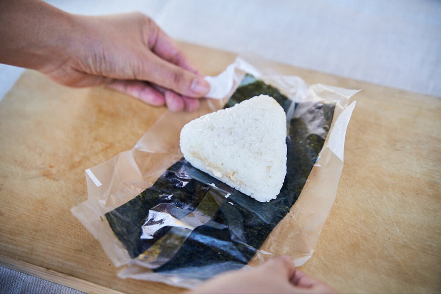 包みのテープをていねいに剥がし、ごはんと海苔をそれぞれ取り出します。海苔は最終的にちぎるので、破れても問題ありません。