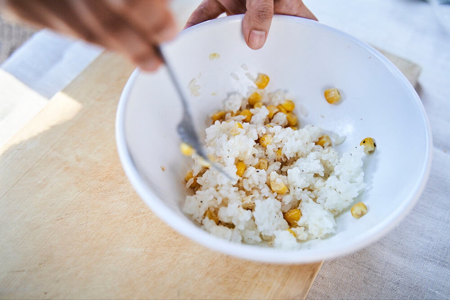 2.ごはん、ホールコーン、塩、黒胡椒を混ぜ合わせる