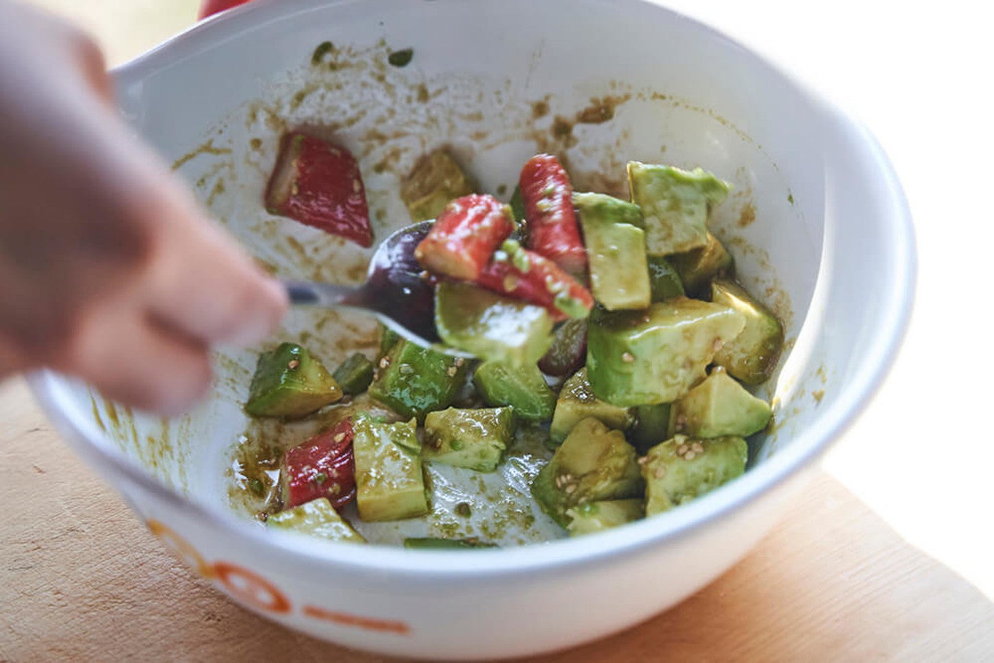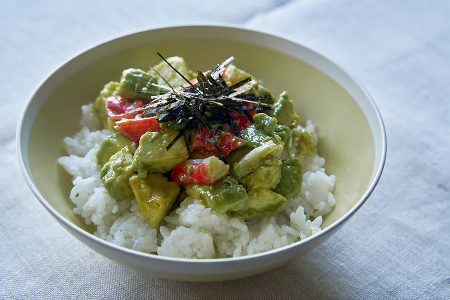 2品目:切って混ぜるだけ!「かにかまとアボカドのポキ丼」