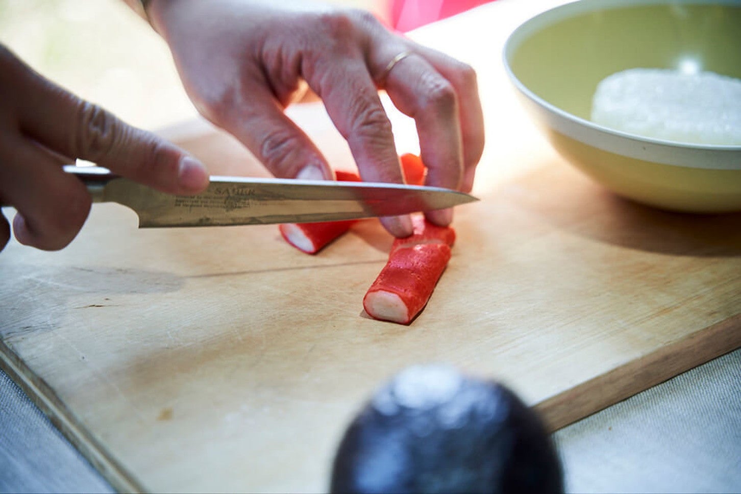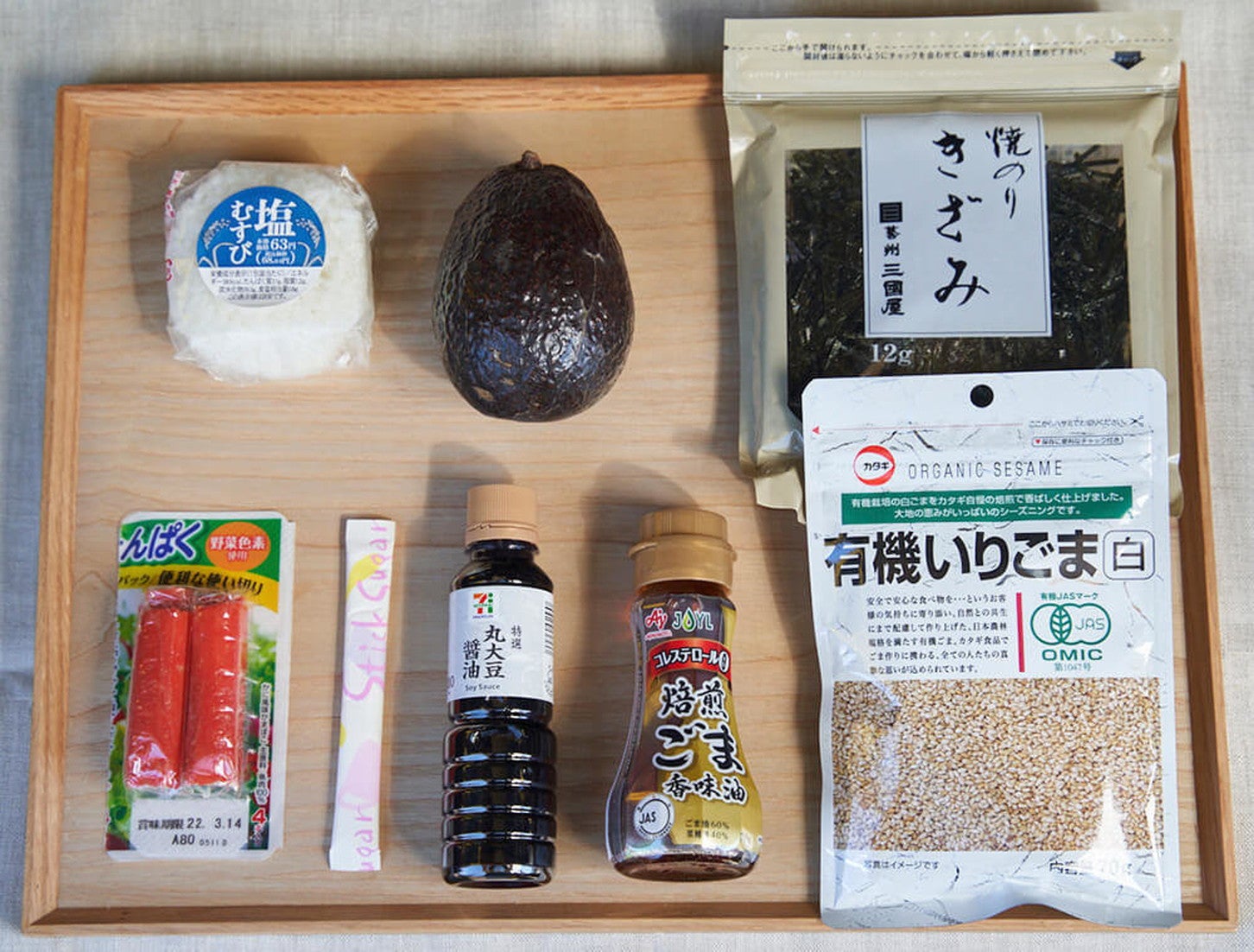 アボカドは皮が茶色く完熟したものを選びましょう。白ごま、きざみ海苔は、チャック式のもの、砂糖はスティックシュガー、しょうゆ、ごま油は小さな使い切りサイズを選んでおくと、持ち運びに便利です。