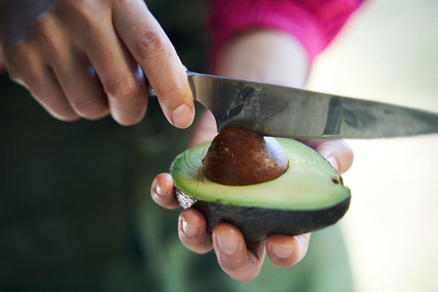 アボカドは縦にグルリと一周包丁で切り目を入れます。瓶のフタを開けるようなイメージで、軽く実をねじり、2つに分けます(片方に種がついた状態)。