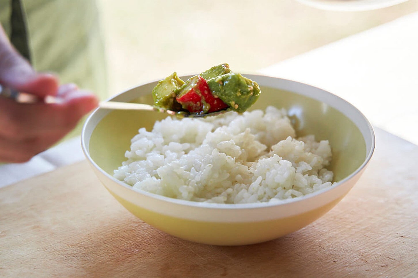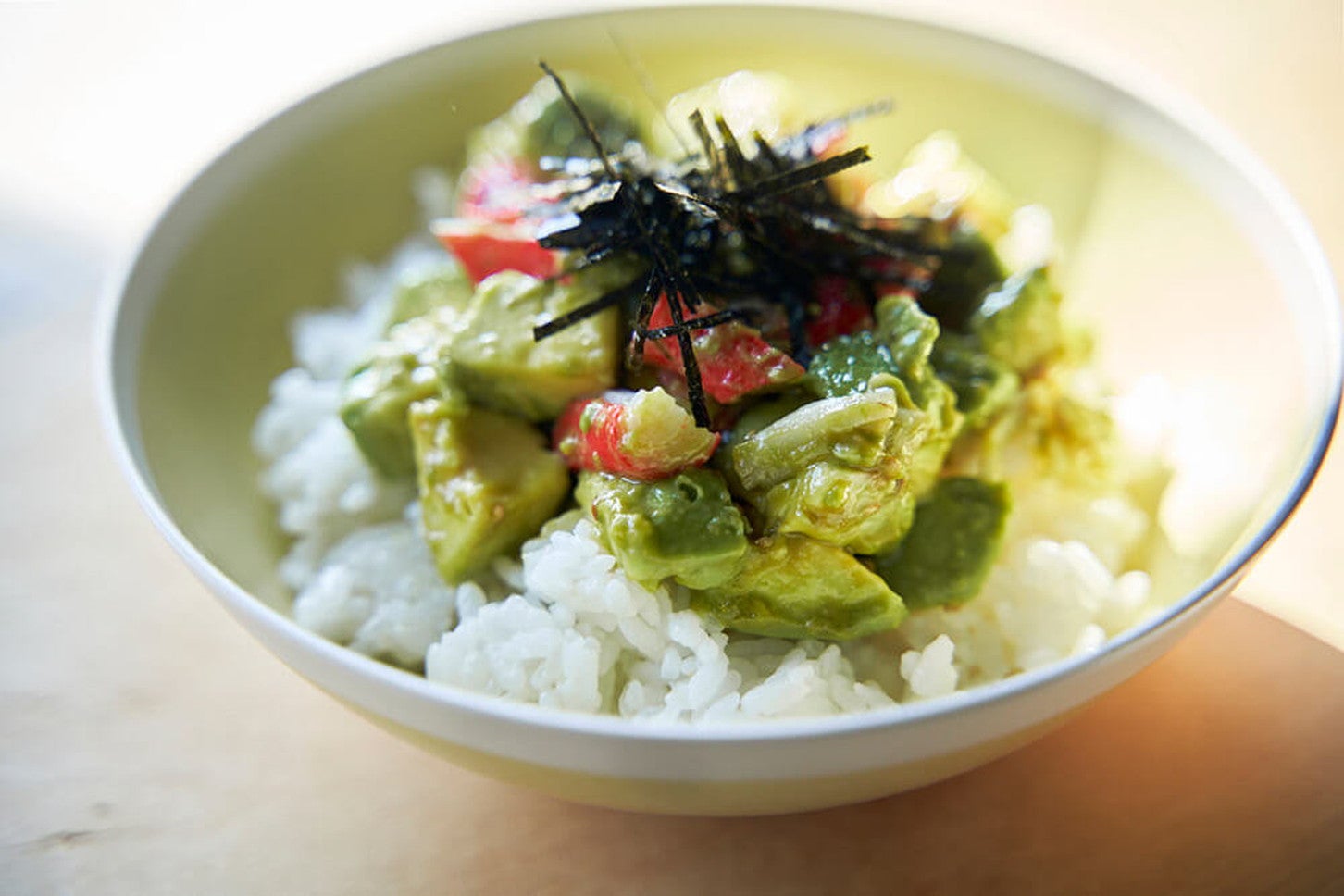 お次は、マグロの刺身とアボカドをあえてごはんにのせた、ハワイアンフード「ポキ丼」をイメージした一品。