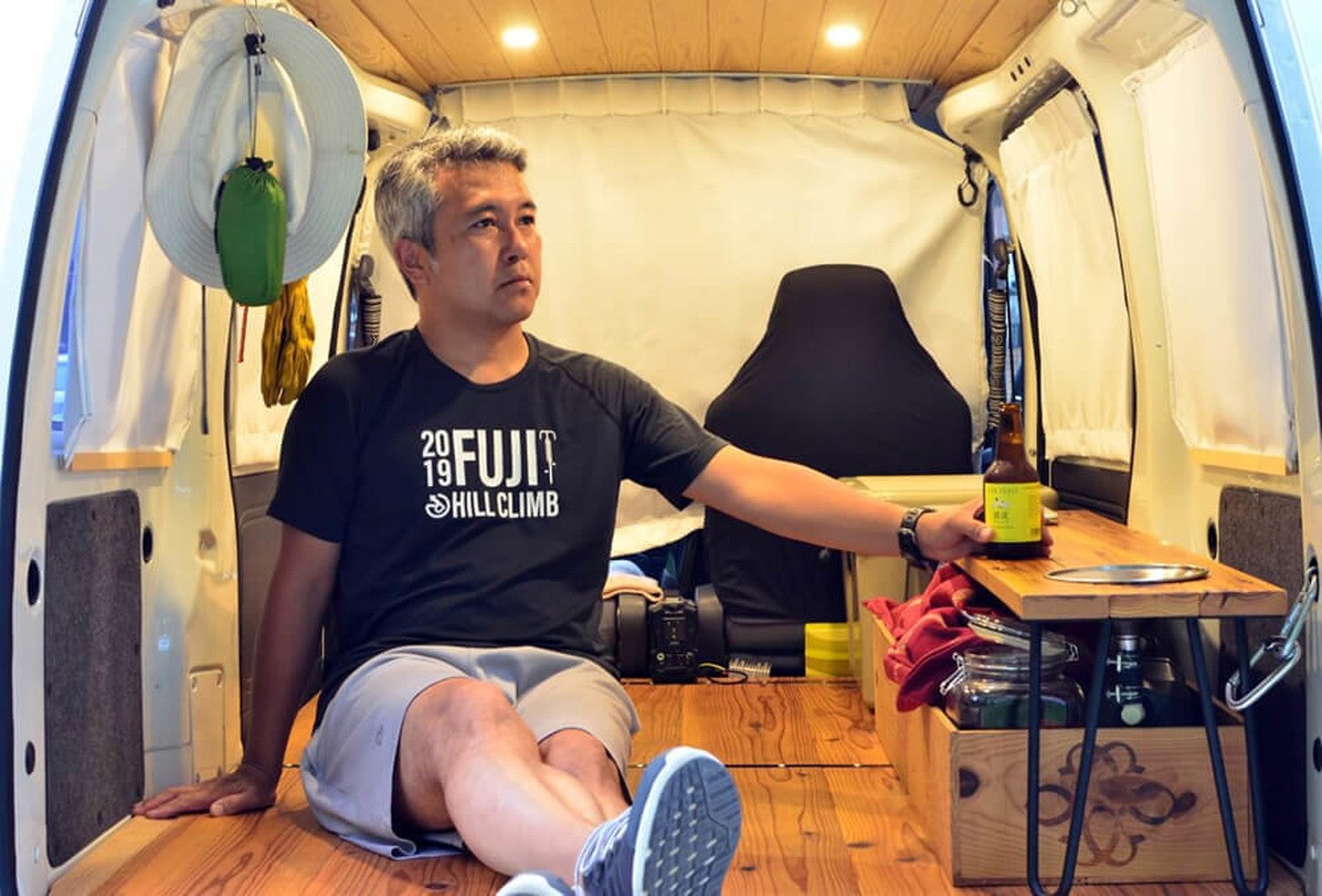 テーブルがあると、車内生活の質が格段に向上します。クルマの中は意外に平らな面がないので、食べ物や飲み物を置いたり、小物を置いたりできるテーブルは、ぜひ用意したいですね。