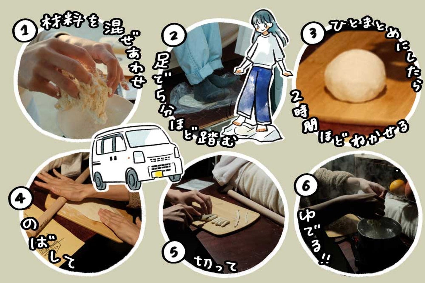 材料を混ぜ、こね、床の上で足踏み。そのあとうどんを2時間ほど寝かせます。
