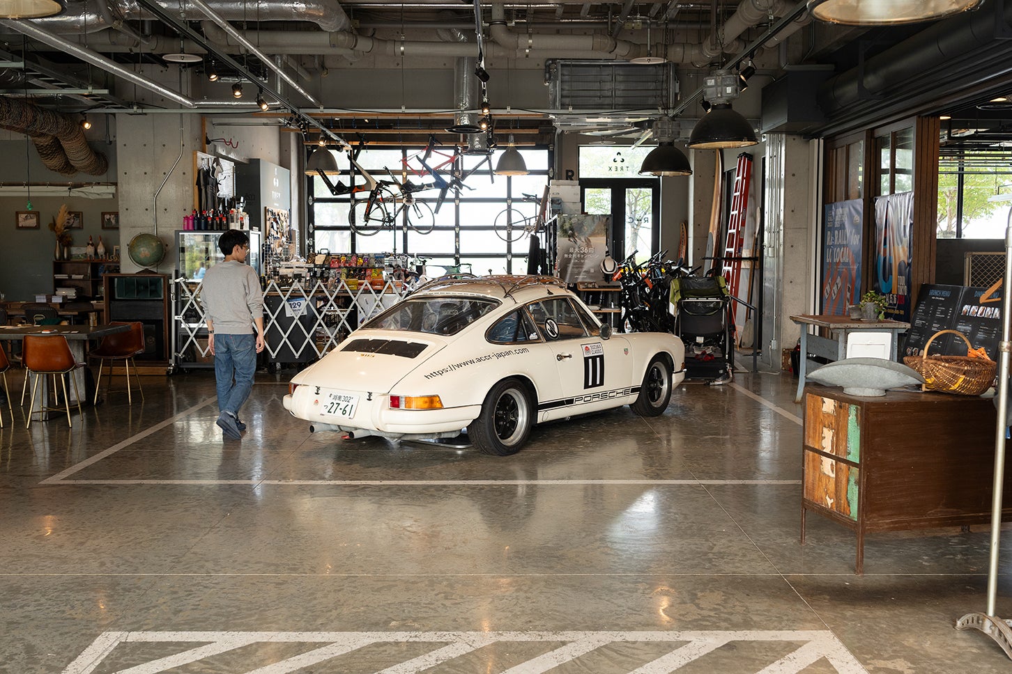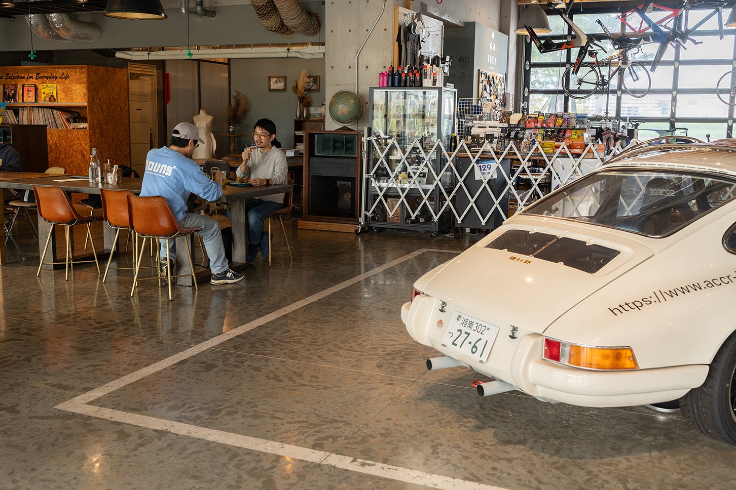 重厚な扉を開くと、真っ先に目に飛び込んでくるのが空冷ポルシェ911。この時点で心を掴まれてしまう。インダストリアルな空気感と抜けのある店内空間に、見事にマッチしていてとにかくカッコいい。