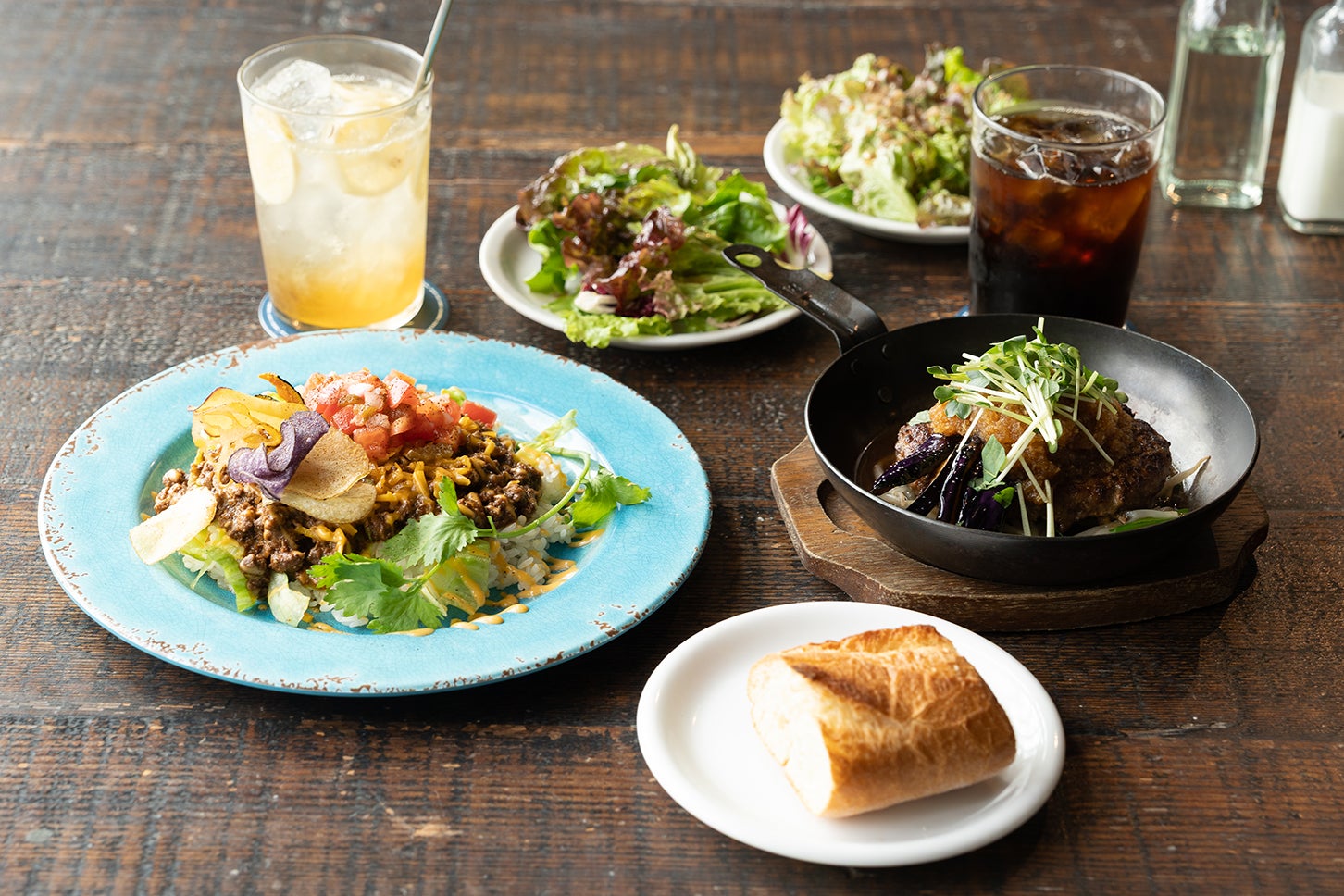 席に着く前から見どころ満載だけれど、ここはカフェ。案内していただいた席に腰をかけメニューを見せていただく。魅力的な料理名が並ぶメニューの中から、今回はランチメニューである「根菜チップのせビーフタコライス」と「ハンバーグおろしポン酢」を注文することに。飲み物は自家製のレモネードを選んだ。