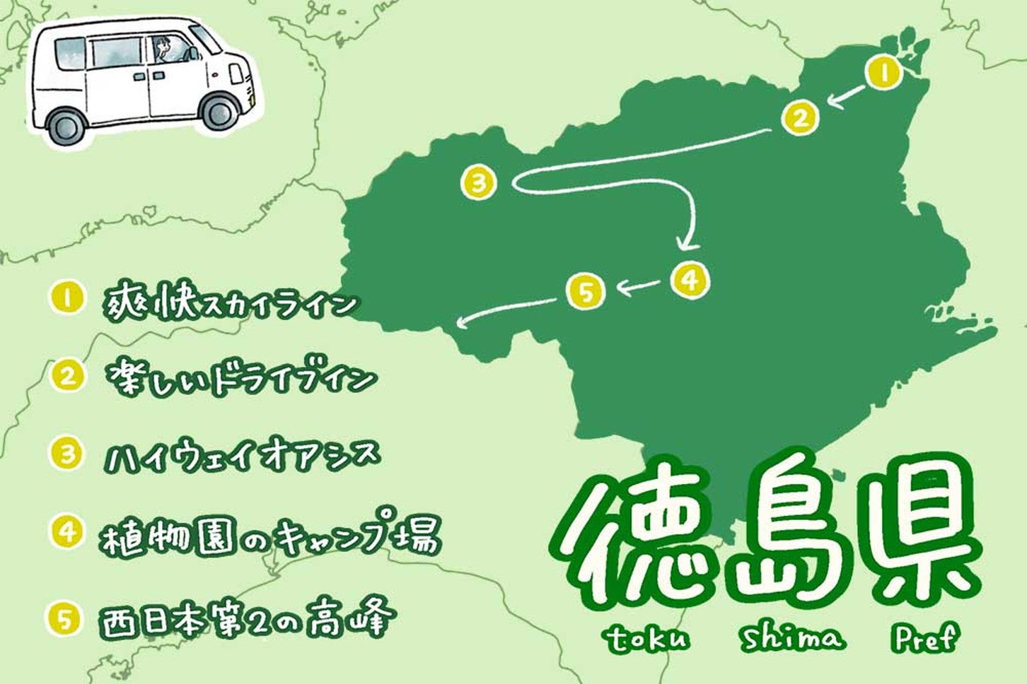 イラストレーター・いとうみゆきさんのクルマのおうち旅・四国編。愛媛で美しい景色を堪能しながらドライブを楽しみ、香川では粉から手打ちうどんを作り、次なる目的地は徳島県! 初夏になり、暑い日も増えてきました。ひんやりグッズを詰め込んで、目にも涼しい海沿いを走って、ドライブインで冷たいジュースを手に入れて、汗をかいたら温泉に入って、気温が下がることを期待して標高の高い山に登って……! 少しでも涼しく快適なクルマ旅になるように意識しながら、いとうさんと白くまの楽しい旅は続きます。