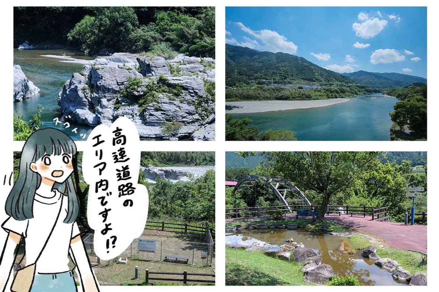 展望台から見えるのは「清流吉野川」(右上)と、その川の中にたたずむいくつもの奇岩が生み出す県指定名勝天然記念物「美濃田(みのだ)の淵」(左上)、施設内にはドッグラン(左下)や池(右下)、歴史ある橋などがありました。これらが全部高速道路のエリア内にあって高速道路を降りずに楽しめるなんてすごい。