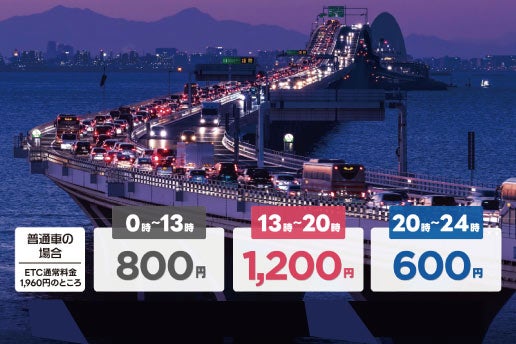 東京湾アクアラインでは、土日・祝日の混雑緩和のため木更津~川崎方面の上り線において、特定の時間帯にETC割引料金を変動する社会実験を7月22日から実施する。